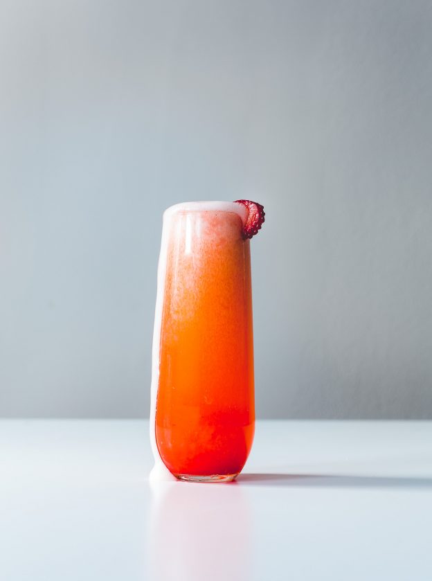 The herbacious quality of gin (I prefer Hendricks) is dynamite with the quick strawberry puree – which is just blended California Giant Berry Farms strawberries, fresh lemon juice, and a smidge of maple syrup. Topped off with an affordable pour of bubbly (Cava or Prosecco is in my budget, but Champagne for the purists if you like)….. it’s the kind of thing I love to sip at brunch, or as a pre-dinner libation. And if you prefer a little less zing, simply leave out the gin.
