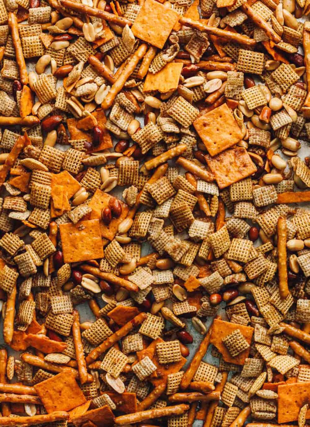 Making it gluten-free isn’t difficult OR time intensive; you’ll just need to buy GF pretzels and cheddar crackers, and then the Corn Chex and Rice Chex are naturally gluten-free. I decided to throw in the slightly broken cheddar crackers even though it’s not traditional, and everyone mentions how much it adds to to the mix when they try it! So don’t skip those. Cocktail peanuts are an absolute must too, but if you have an allergy, I’ve used cashews with great success, too.