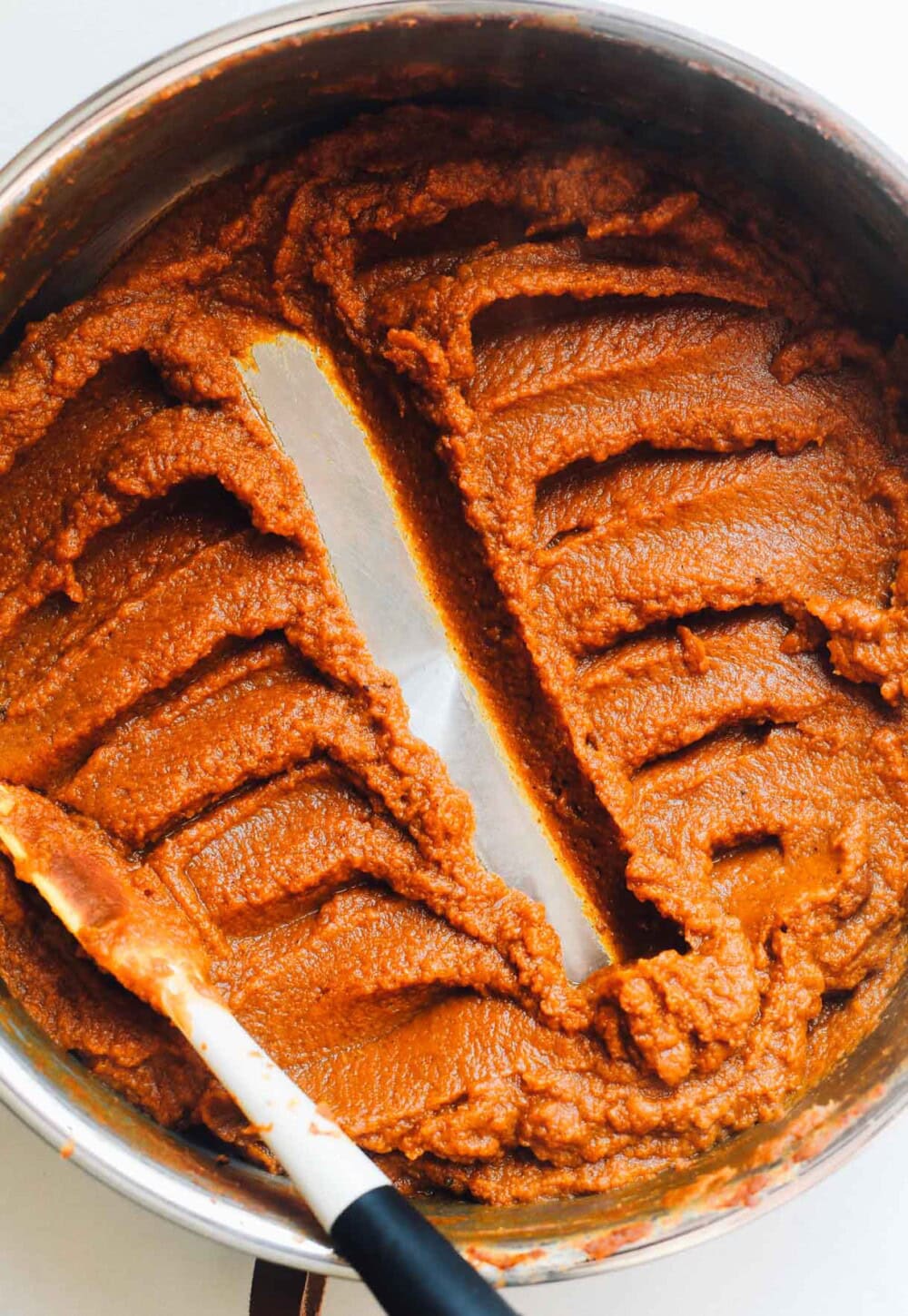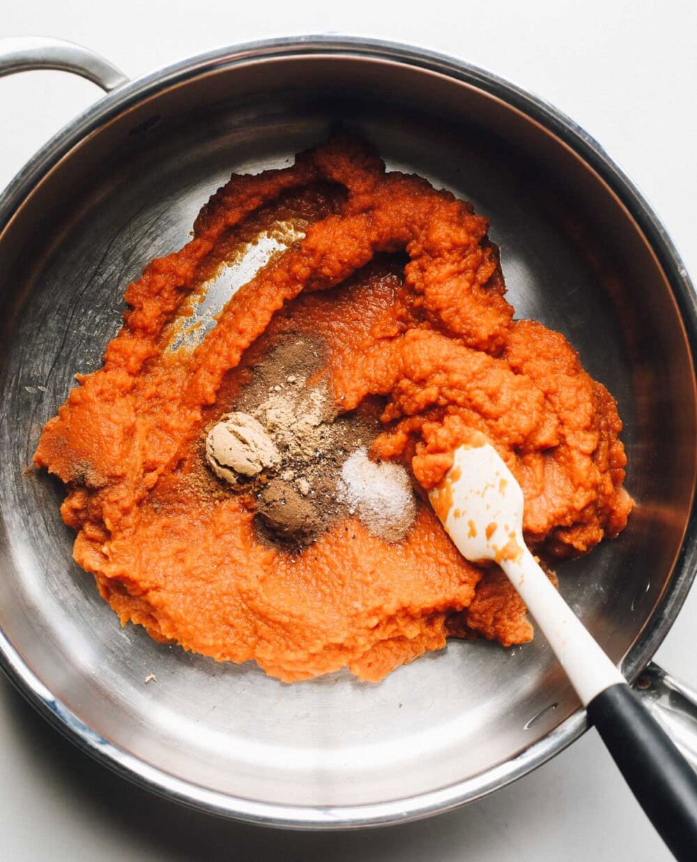 Rather than stirring in the spices with the rest of the ingredients to simmer, I first like to “toast”, or cook, the spices with 3/4 cup of pumpkin puree to release their warm, aromatic notes that add layers of complexity. It’s similar to what you do when making curry or chili, and makes the end result much more flavorful.